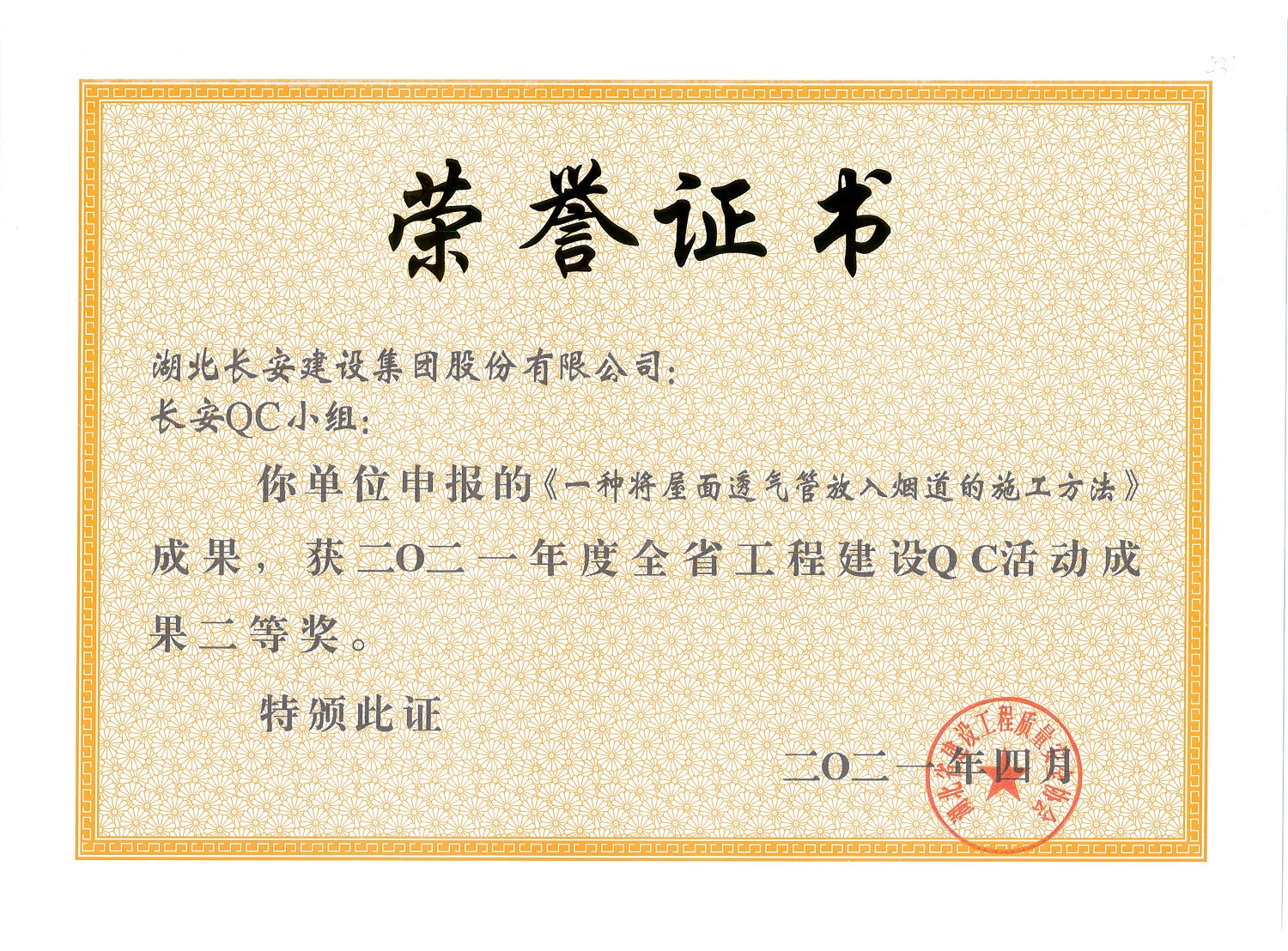 長安QC小組成果——《一種將屋面透氣管放入煙道的施工方法》榮獲2021年度省QC成果二等獎