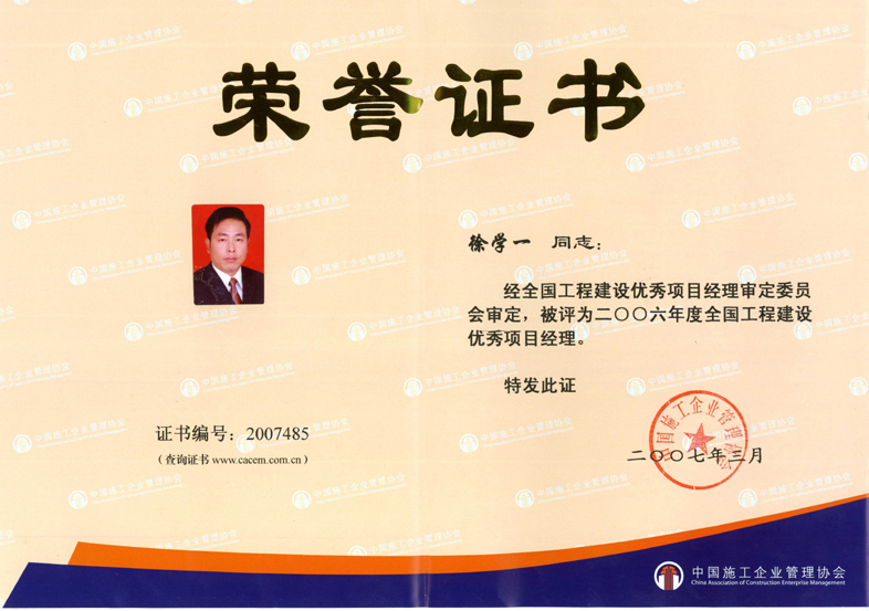 2006年度全國工程建設(shè)優(yōu)秀項(xiàng)目經(jīng)理(徐學(xué)一)
