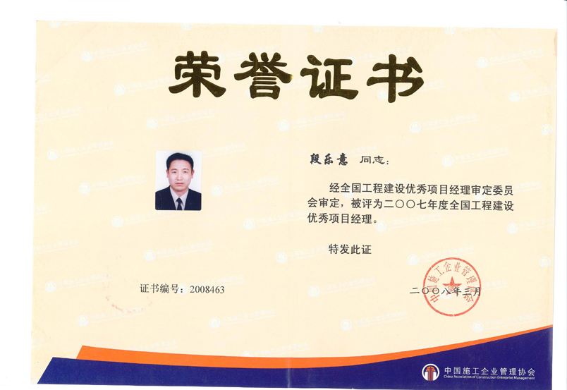 2007年度全國工程建設(shè)優(yōu)秀項(xiàng)目經(jīng)理(段樂意)