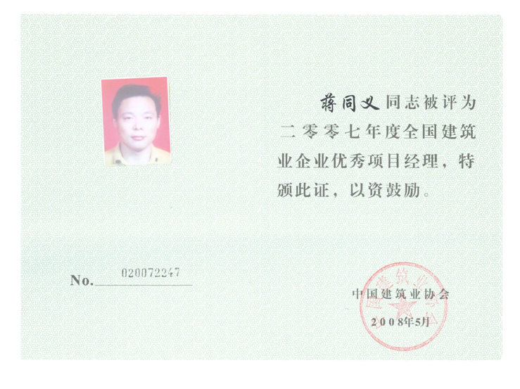 2007年度全國建筑業(yè)企業(yè)優(yōu)秀項(xiàng)目經(jīng)理(蔣同義)