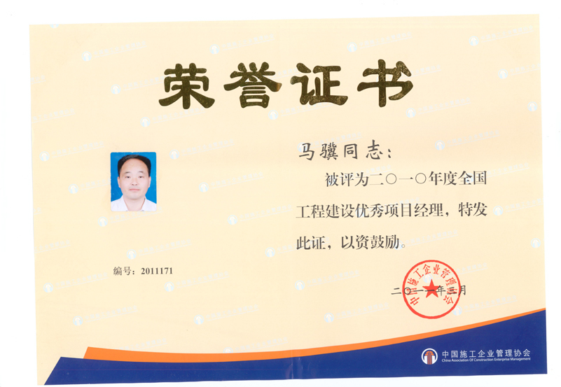 2010年度全國工程建設(shè)優(yōu)秀項(xiàng)目經(jīng)理(馬驥)