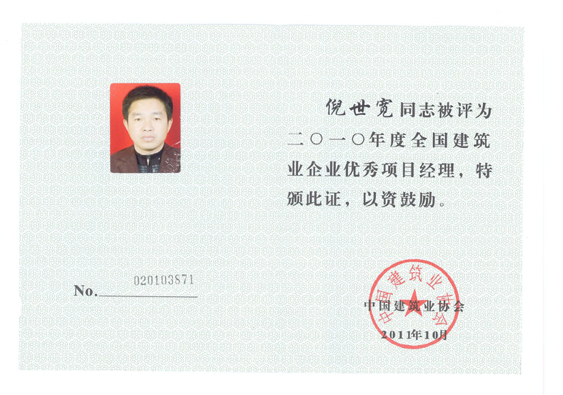 2010年度全國建筑業(yè)優(yōu)秀項(xiàng)目經(jīng)理(倪世寬)