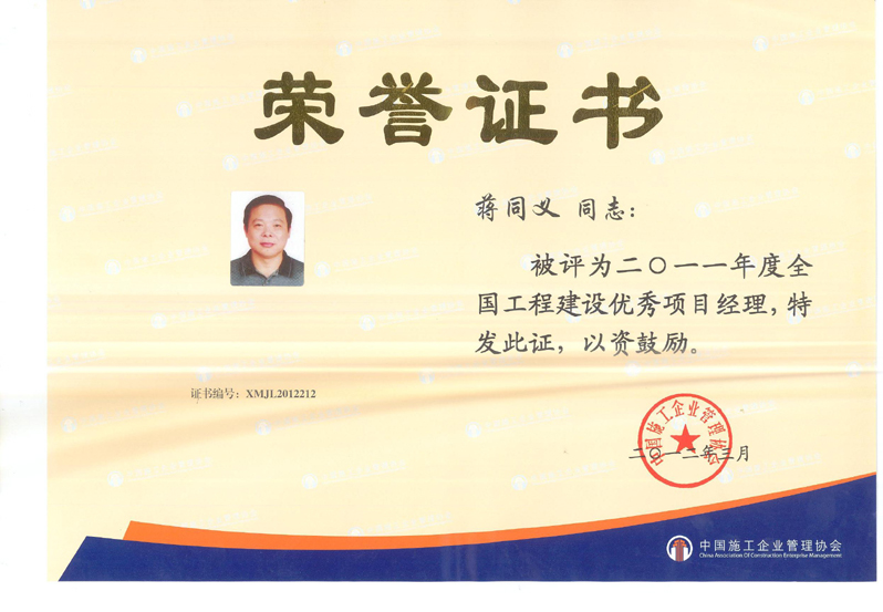 2011年度全國工程建設(shè)優(yōu)秀項(xiàng)目經(jīng)理(蔣同義)