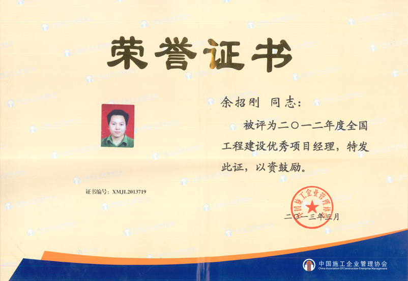 2012年度全國工程建設(shè)優(yōu)秀項(xiàng)目經(jīng)理(余招剛)