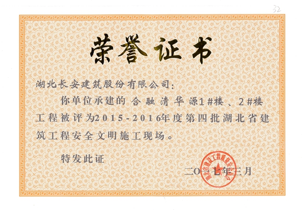 合融清華1#樓、2#樓被評為2015-2016年度第四批省安全文明施工現場([2017}7號)