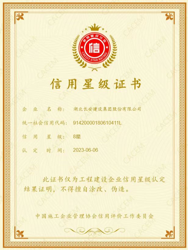 6月16日,中國施工企業管理協會官網發布《關于公布2023年第八批工程建設企業信用星級認定結果的通知》,湖北有8家工程建設企業上榜,集團公司是唯一被認定“8星”信用的工程建設企業。