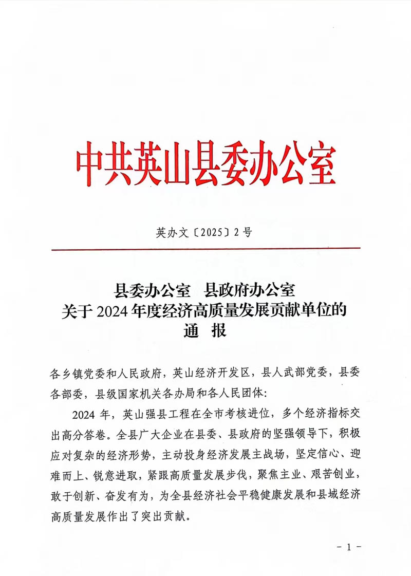 2月10日,英山縣2025年三級干部會議在英山縣禮堂召開。集團(tuán)公司榮庸“2024年度經(jīng)濟(jì)高質(zhì)量發(fā)展貢獻(xiàn)單位”稱號,在“2024年企業(yè)納稅貢獻(xiàn)排名前10位”中榮居第1位。